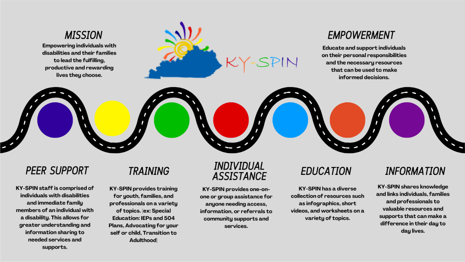 KY-SPIN (Special Parent Involvement Network) Parent Center is a statewide project of KY-SPIN, Inc. KY-SPIN Parent Center PTI (Parent Training & Information Project) is funded by the U.S. Dept. of Education. KY-SPIN Parent Center provides training, information and support for children and youth with all types of disabilities (birth through 26 years old), their parents, families, and professionals. The mission of KY-SPIN is to link families and individuals with disabilities to valuable resources that will enable them to live productive, fulfilling lives.